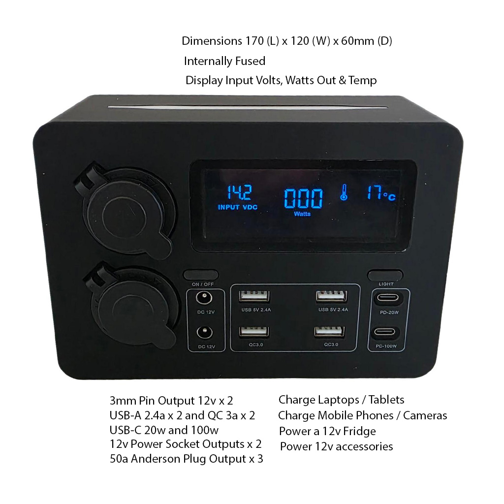 Perfect power distribution box for charging phones, cameras, powering a 12v fridge running LED lights from